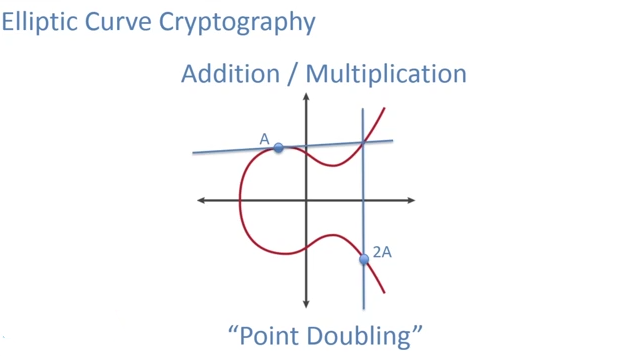 So to calculate 3A, we perform point doubling three times, so we add A to itself 3 times so we draw a line between 2A and A and where the line cuts the curve, we draw a vertical line across the x-axis and this new point is 3A. so, to perform few computations involves a lot of jumping around the curve , this is where ECC gets its strength since it is infeasible to divide the multiplication and find the specific point you multiplied to get there , unlike regular algebras. And this is known as the Elliptic Law Discrete Logarithm.